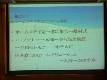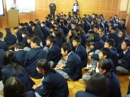 2年生は多目的室で4月に行く修学旅行の行程を確認しています