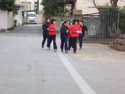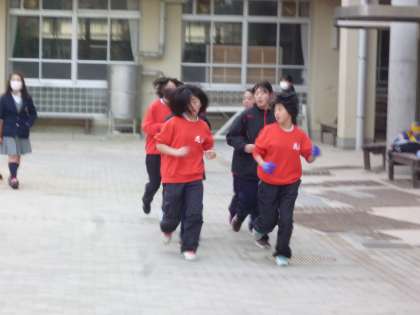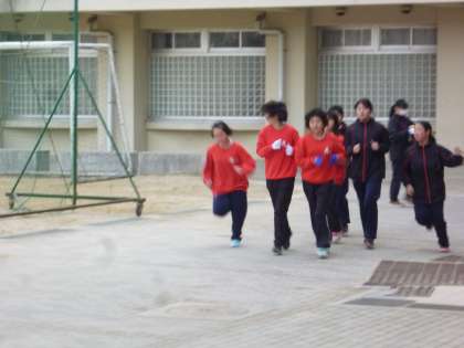 女子バレーボール部が校庭で朝練習です
