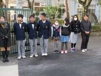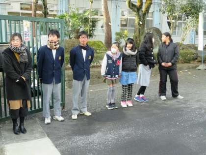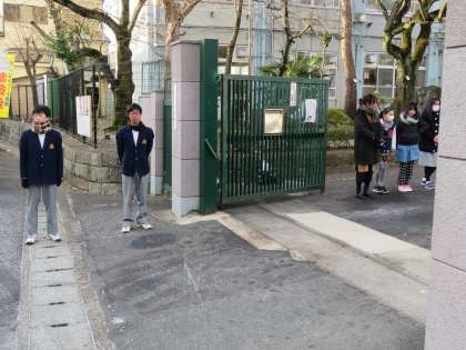 毎週月曜日は,生徒会本部が小学校に出向きあいさつ運動を小学校と合同で行います
