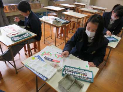 2年生が美術で展開図のようなものに着色をしています