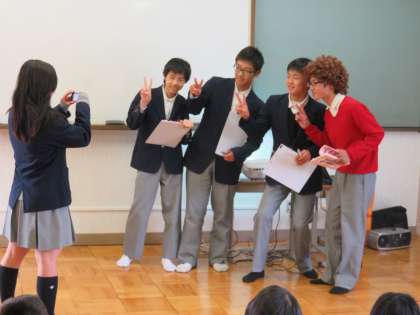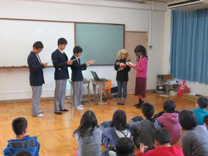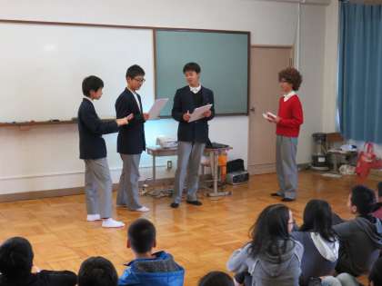 陵ヶ岡小学校の6年生に生徒会本部が英語のフィールドワークの様子を寸劇風にして説明しています