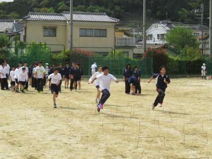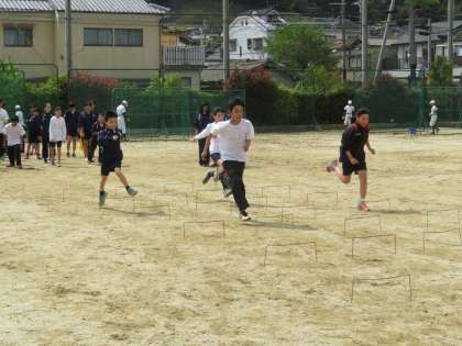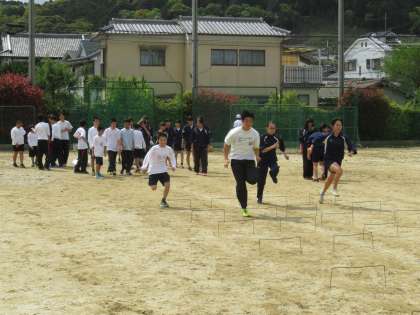 陸上部がグランドで新入生とともに練習です