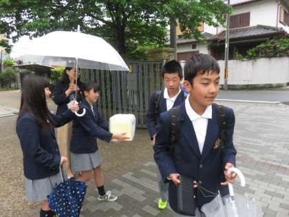 生徒会・PTAのみなさんが大きな声で募金をよびかけます。