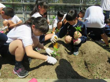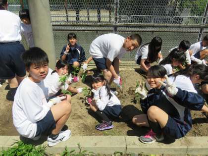 暑いくらいの陽射しのもと,苗植えに取り組みます