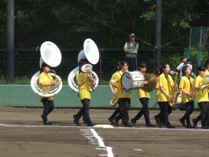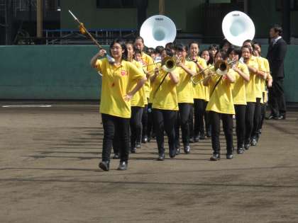 強い陽射しの快晴のなか,入場を先導します