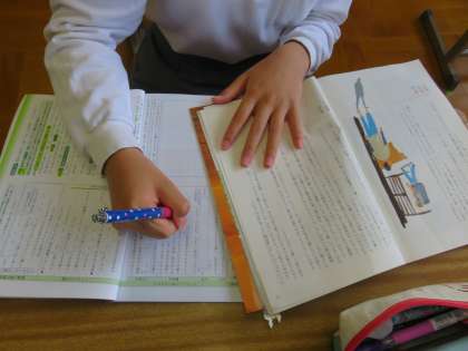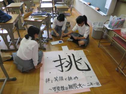 今日も早朝の風景ですが,学級旗をつくっている人がいます。