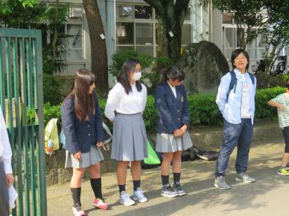 陵ヶ岡小学校で小中合同の朝のあいさつをおこないました