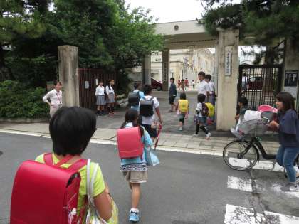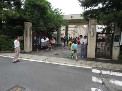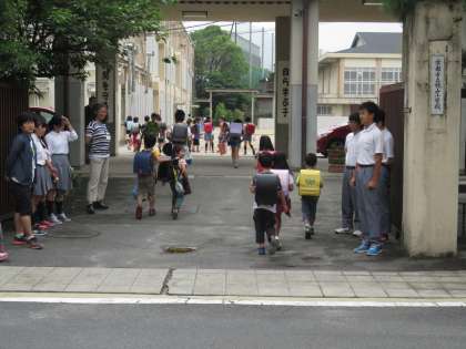 鏡山小学校へ生徒会本部が行き,朝のあいさつです