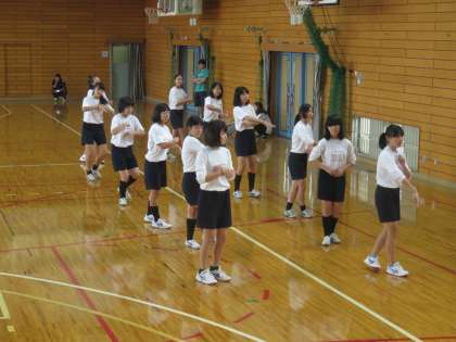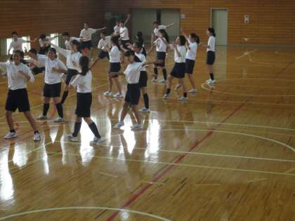 体育館で3年生が京炎そでふれの練習です