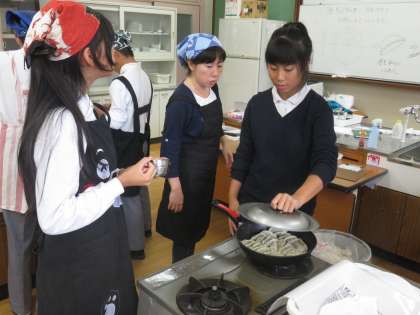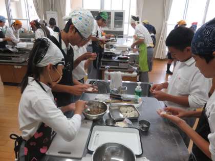 メニューは水菜入りの餃子です。この水菜は学校の菜園で収穫したものです