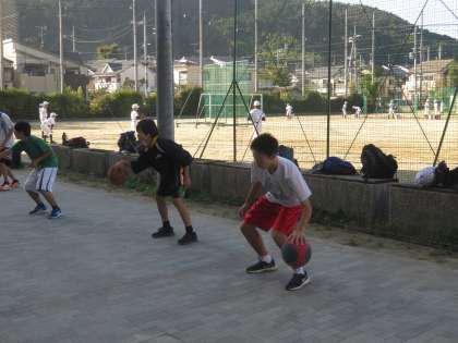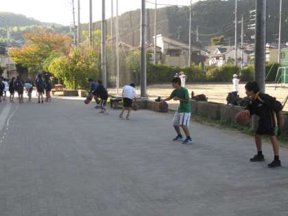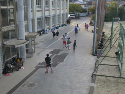 男子バスケット部は校庭で基礎練習中。