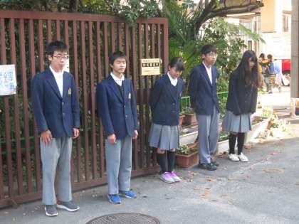 新生徒会の活動です。小学校の校門であいさつ運動です