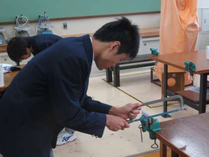 技術の授業で金工に挑戦です。金属板からキーホルダーをつくるようです