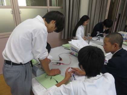 理科室で2年生が電圧の実験に取り組んでいます