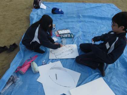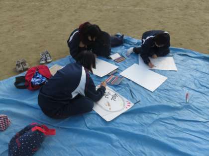グランドの各グループの場所では,ポスター係りがポスター作りに取り組んでいます。