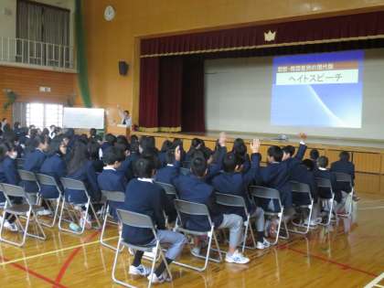 2名の講師をお招きし,外国人問題について学びました。講演後の質問タイムでは生徒たちから,素朴な疑問が多く出て,活発な質疑応答がなされたのが,とても印象的でした。