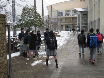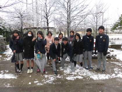 雪の朝,3年生評議員によるあいさつ運動です。
