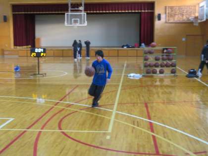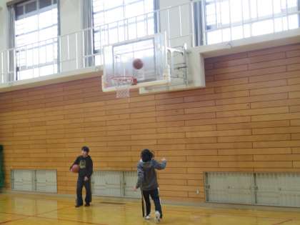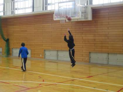 体育館は冷凍庫のような寒さですが,朝から男女バスケット部が朝練習に励んでいます。