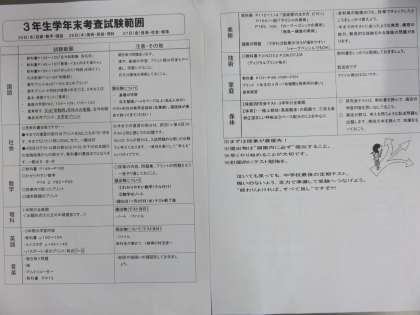 3年生の学年末考査1週間前となりました。日程は,1月25日26日27日の3日間です。3年生は入試日程の関係で,学年末考査が1・2年生より1か月ほど早く実施されます。学年末考査の時間割と試験範囲も発表され,紙面も配布されています。しっかりと準備をして臨みましょう。なお,1・2年生の学年末考査は2月22日〜24日の約1か月後です。