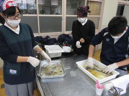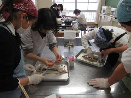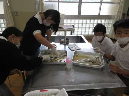 2年生が調理室にて理科の授業でイカの解剖を行っています。