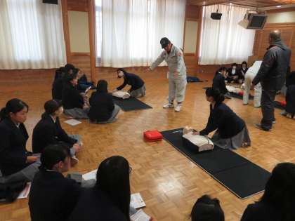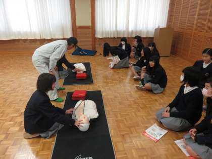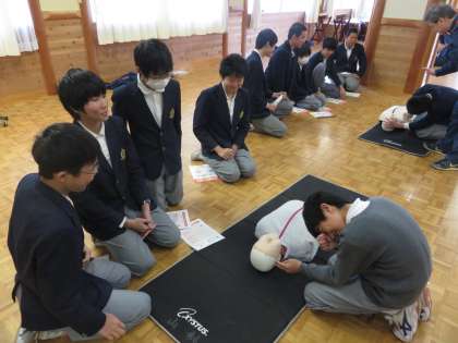 模型に向かって,真剣に「大丈夫ですか」と問いかけ,反応がないのを確認したのち,心肺蘇生にはいります。