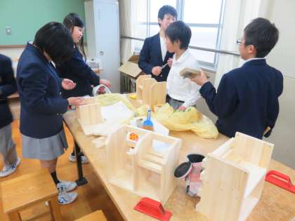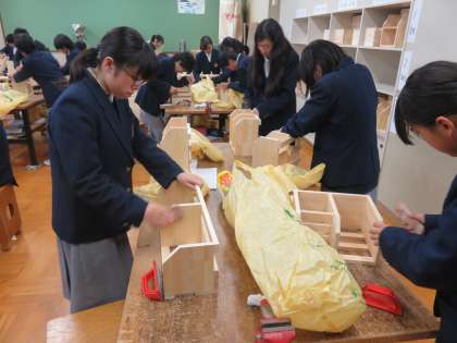 1年生の技術は昨年から取り組んでいる木工がいよいよ大詰めです。