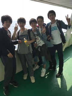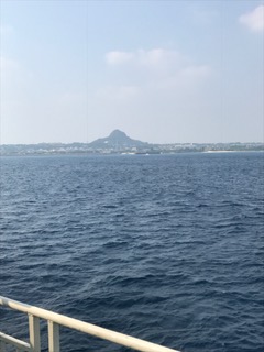 フェリーに乗って、ファームステイ先の伊江島へ向かいます。到着の伊江島が見えてきました。