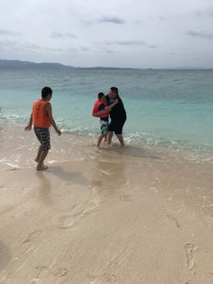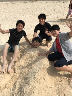 伊江ビーチの様子です。美しいビーチでのみんなの笑顔は最高。先生が海辺で生徒と柔道をしています。