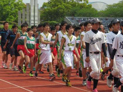 100名が整然とまとまった元気ある行進を見せてくれました。明日からいよいよ大会が始まります。花山中学校の躍進が期待される開会式でした。