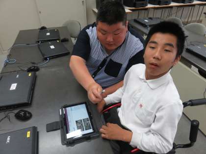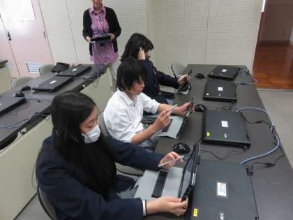 コンピュータ室でタブレットを使って菜園記録の整理です。
