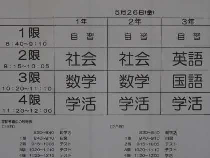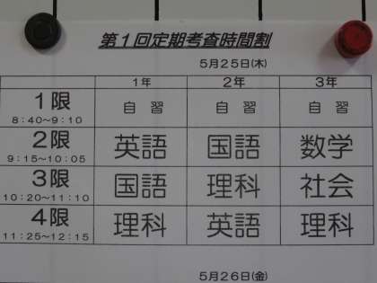 5月25日(木)26日(金)に実施される第1回定期考査の時間割が発表されました。