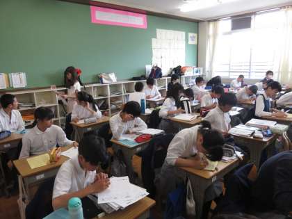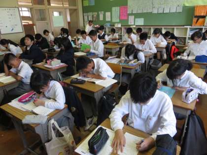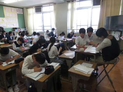 放課後学習では,基本は各自のペースや予定にあわせた学習を行いますが,各教科から配布された改題プリント等を使用する場合もあります。また,学年の先生もついていますので,質問等もOKです。