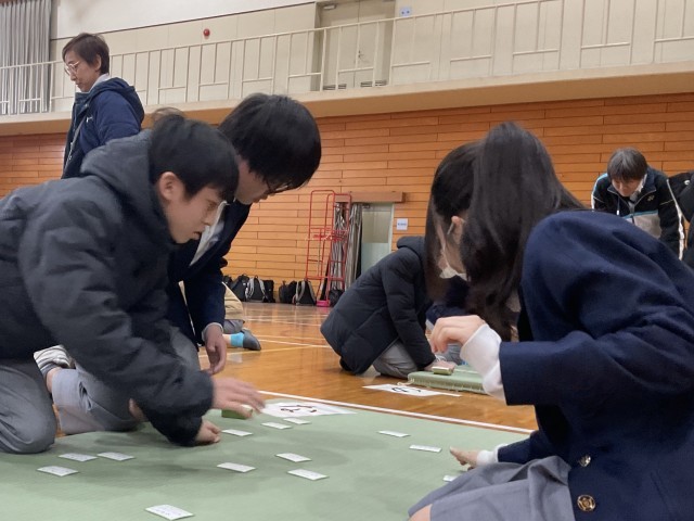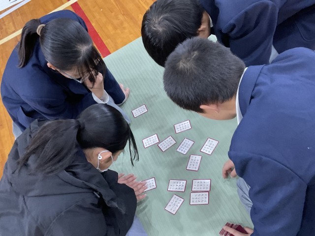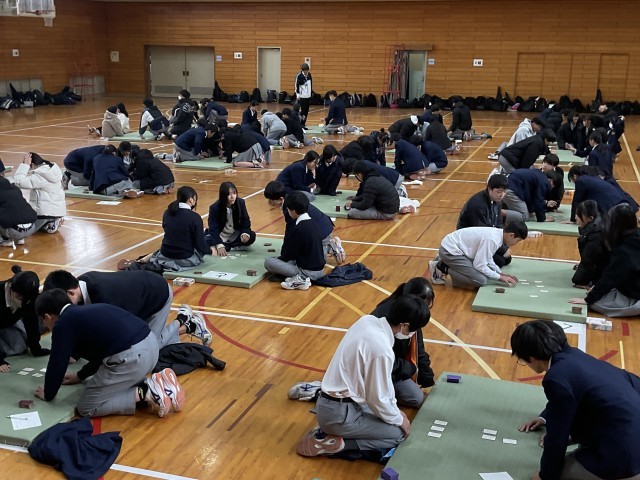 本日6限、2年生の百人一首大会が開かれました。シーンと静まる中読み上げる声、札を叩く音、歓声、笑い声、終始おおにぎわいの大会でした。