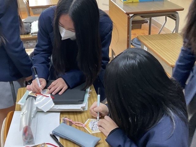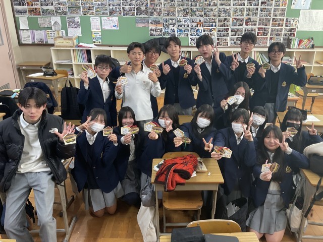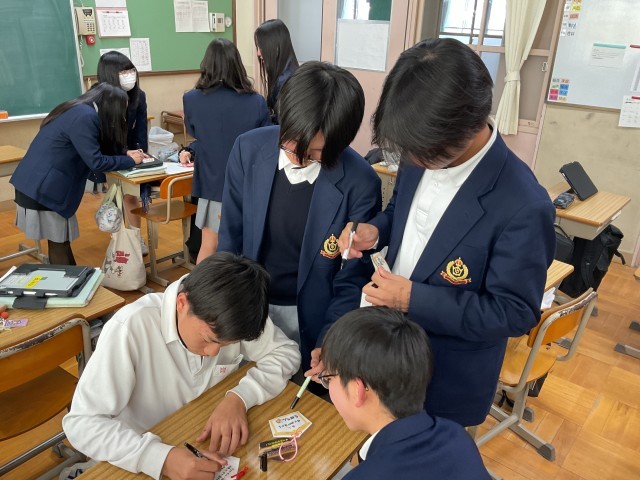 3年生の中でも日程が早い他府県の学校を受験する生徒は、既に受験が始まっています。それに合わせて各クラスではお守りの作成をしており、このクラスでは友達や先生にメッセージを書いてもらって、とっておきのお守りを作っていました。みんないい表情です。1日1日迫ってくる入試当日に向け、時間あるかぎり準備を進めていきましょう。