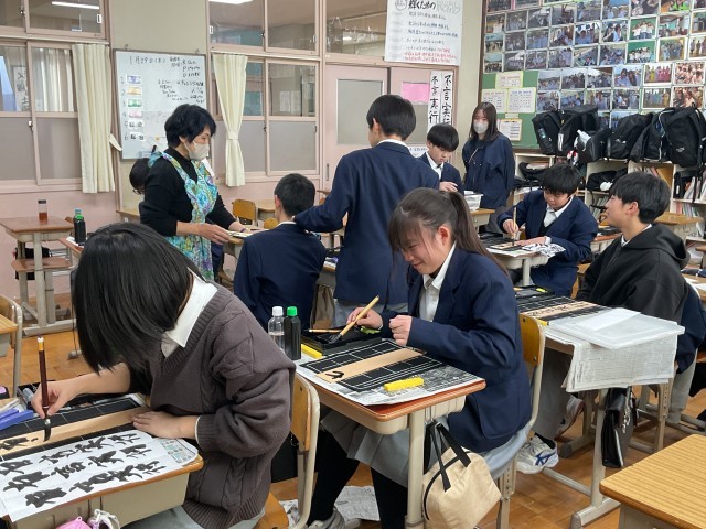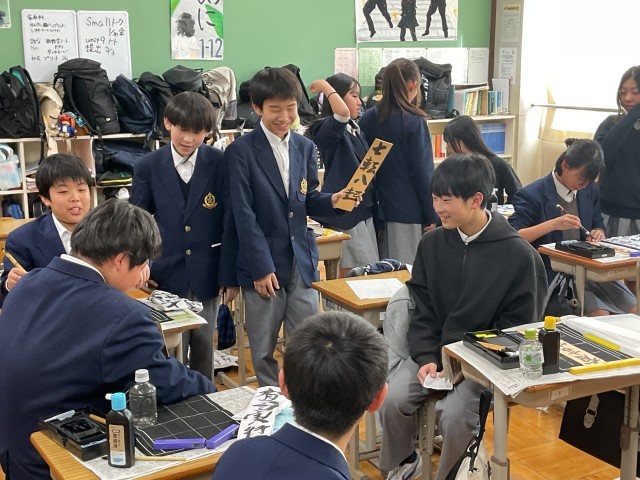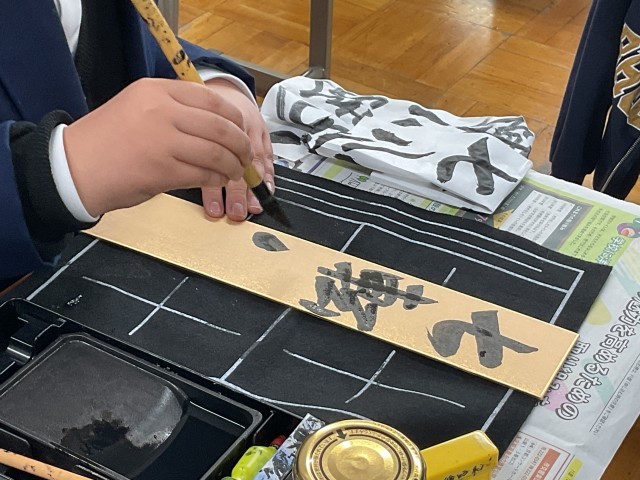 こちらは書道の様子です。何度も練習をしたのち、素敵な色紙に清書をしていました。"味"のある字を目指して、互いの作品を見せ合ったり褒めあったりと楽しんでいました。