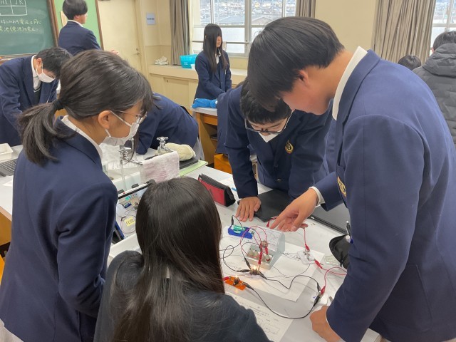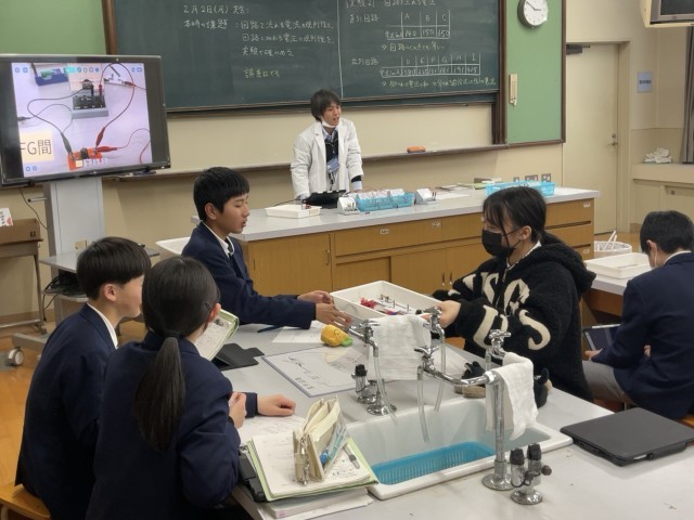2年生理科では、回路に流れる電流と電圧の規則性を学ぶ実験が行われていました。自分達で接続を変えてみて電球の光り方や電流計の数値を確認していました。どのグループもメンバーで協力しあいながら実験を進めていました。