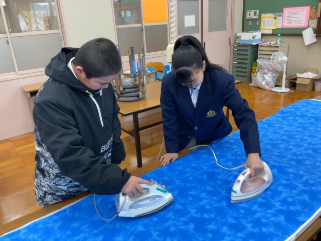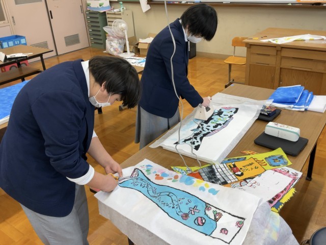 1組美術の様子です。小さな巨匠展に向け、各自が作成した鯉のぼりを貼り合わせる最後の工程に差し掛かっていました。それぞれ順番に持ち場につき、丁寧に作成を進めていました。