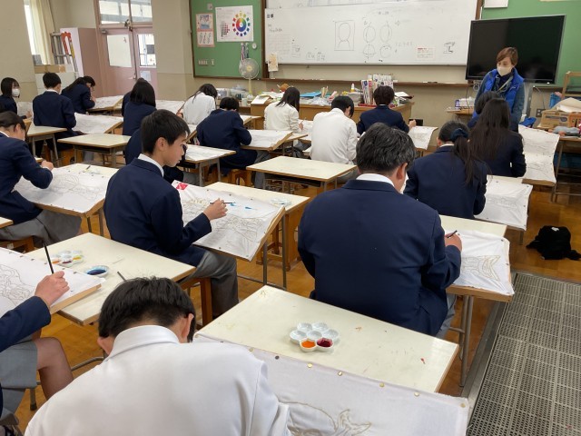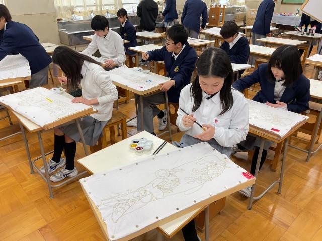 1年生美術の様子です。前回ホームページでお伝えした時は着色前の段階でしたが、今日ついに着色の工程に入りました。どんな色づき方をするのかワクワクしながら進めており先生からの「明日も美術の授業があるのでどんどん塗っていきましょう!」という声かけに対し「やったー!」と喜びの声があがっていました。またホームページで進捗をご報告できればと思います。