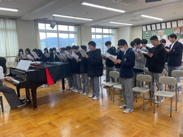 2年生音楽の様子です。3年生を送る会に向けて合唱をしています。授業後半では、全体で歌ってはパートで集まり、気になる部分について話し合ったり歌いあったり、気付けばピアノの近くに集まってきて先生と一緒に歌い込んで授業終わりの合唱にのぞんだりと積極的に学んでいました。次回の授業もがんばりましょう!