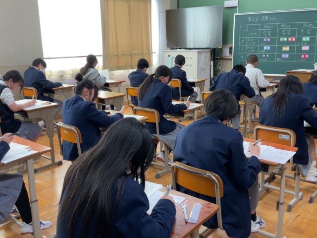 1年生の様子です。今年度最後ということもあり、時間いっぱいテストに励んでいました。「思ったより難しかった」「結構書けたけど…」「これは自信ある!」などテスト後の感想は様々でした。テストはあと2日間続きます。気を緩めず、今日の午後の時間を有効に使いましょう!