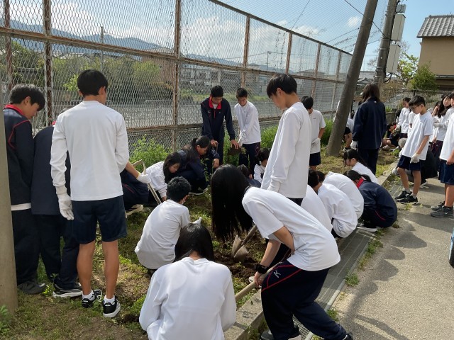 2年生、いいお天気の中、菜園のための土起こしをしました。