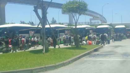 ガマ見学に向かうためバスに移動している様子です。