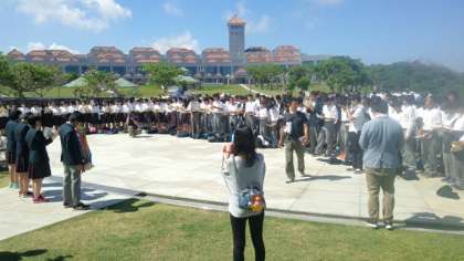 平和セレモニーを行いました。その中で平和宣言をし、平和への祈りを捧げるために合唱を全員で行いました。その後、学級写真を撮り、平和資料館の見学に行きました。ガマでの体験、平和セレモニーを通して、改めて平和の大切さを実感しました。