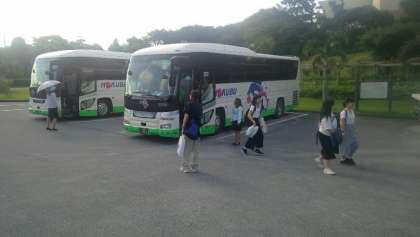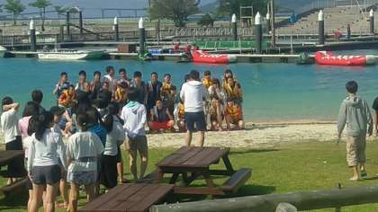 Aグループは8時30分にもとぶ元気村に到着しました。更衣後、マリン体験・文化体験の説明を受け、クラス写真を撮影後、それぞれの活動〔3っの体験(バナナボート、カヌー、文化体験…シーサー作り)のローテーション〕に入ります。