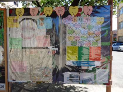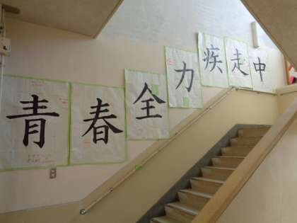 校舎内の階段には秋の行事に向けての意気込みを感じる掲示物があります。また、渡り廊下の掲示板には、保健委員会が作成した歯磨き啓発の作品に目がとまります。
