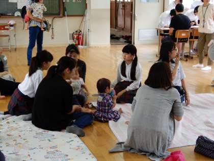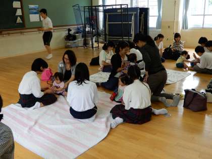 本日昼休みの時間帯に、近隣にお住まいの赤ちゃんがお母さんと一緒に16組も来て下さいました。日常赤ちゃんをダッコできない生徒も、積極的に参加しました。