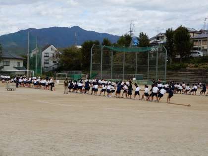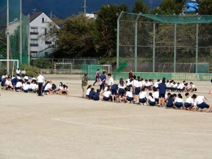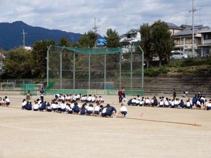 10月4日(木)に行われる第70回記念体育大会に向けての学年練習がグラウンドで行われました。ここのところ雨続きで学年練習はことごとく体育館で行われていました。本日、初めてのグラウンドの学年練習でした。本日1・2限は2年生が、3・4限は3年生が行いました。爽やかな秋風が吹く中、元気一杯に練習をしました。この後、台風24号の動きが気になりますが、良い天候のもとで体育大会が行えることを願うばかりです。