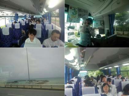 バスに乗り、平和記念公園に向かっています。平和記念公園では、セレモニーを行う予定です。曇っていますが、美しい景色が広がっています。