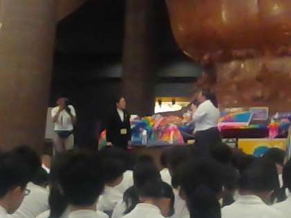 平和ガイドの新里さんからご自身の体験談や沖縄戦の惨さ、また、戦後の沖縄についてお話しをして下さいました。みんな真剣に耳を傾けていました。講演後に代表生徒が感想とお礼を言いました。最後に花束をお渡ししました。