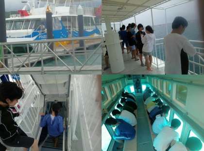 コーラルビュークルージングとは、高速航行で沖合のさんご礁のポイントに移動して、ポイントで船体中央を沈めマリン窓から横方向(3方向)の海底を眺め、楽しむものです。